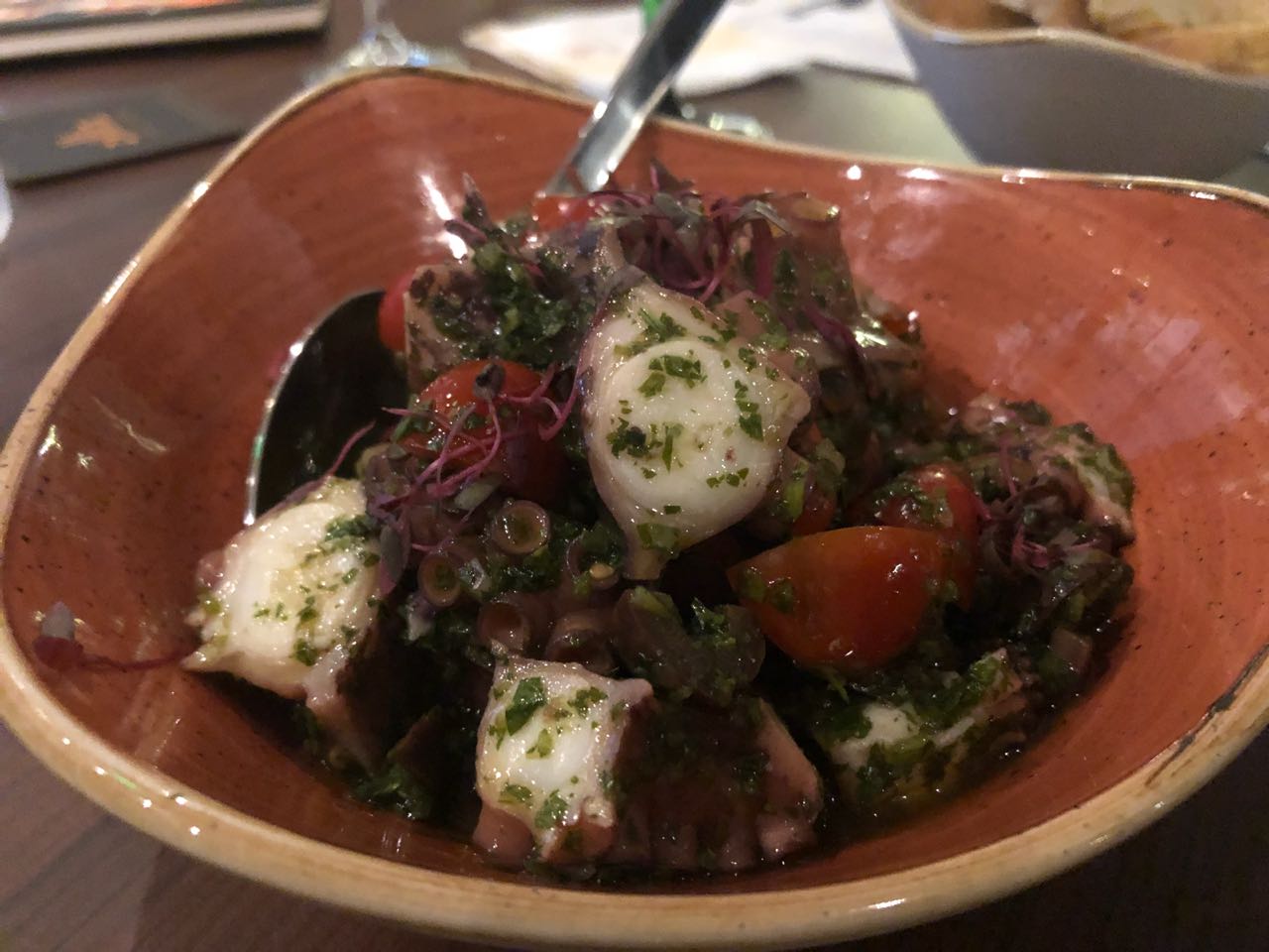 Queria uma entrada mais elaborada e não hesitei em pedir o Polvo em Vinagrete (R$52,00), mas tive uma sensação estranha, porque eu sentia a textura de todos os ingredientes que compunham esta receita, o queijo, os tomatinhos, as azeitonas pretas, ou seja, milhões de possibilidades de sentir vários sabores na minha boca, e, no entanto, eu não sentia o tempero da receita, como se não existisse. Infelizmente uma receita pouco convidativa após seu preparo.