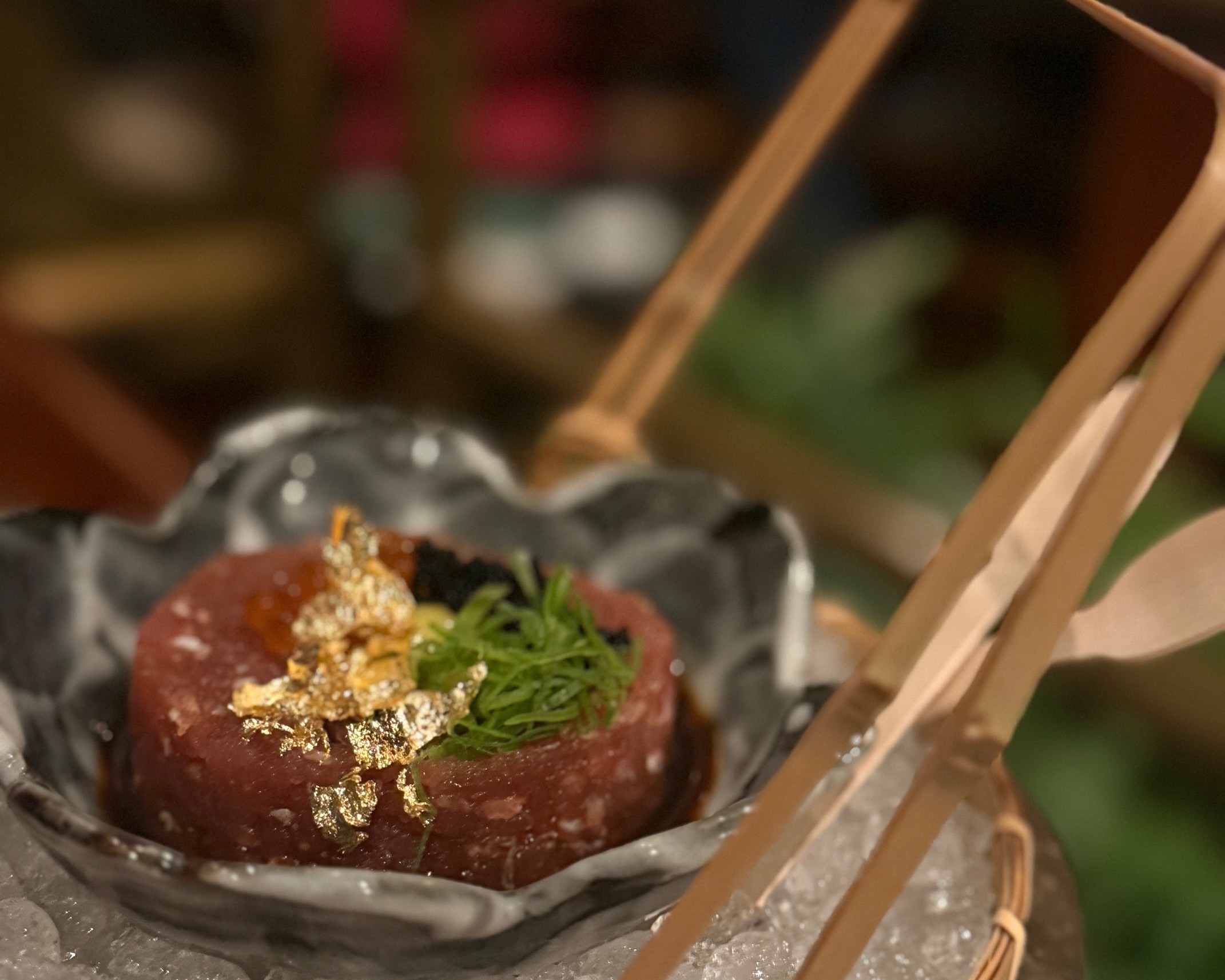 Como era uma noite extremamente quente, continuamos nos pratos frios, e nos foi sugerido o Tartare de atum (R$190,00) Atum fresco bem picadinho, com ovas de peixe, ovo de codorna com pó de ouro, pimenta e molho ponzu. A apresentação foi tão impactante, que deu dó de desmanchá-la. Em compensação a cada garfada era uma explosão palatina, devido a fusão de sabores. O brilho do ouro transformou a iguaria em uma experiencia gastronômica visualmente deslumbrante e luxuosa. Amamos!